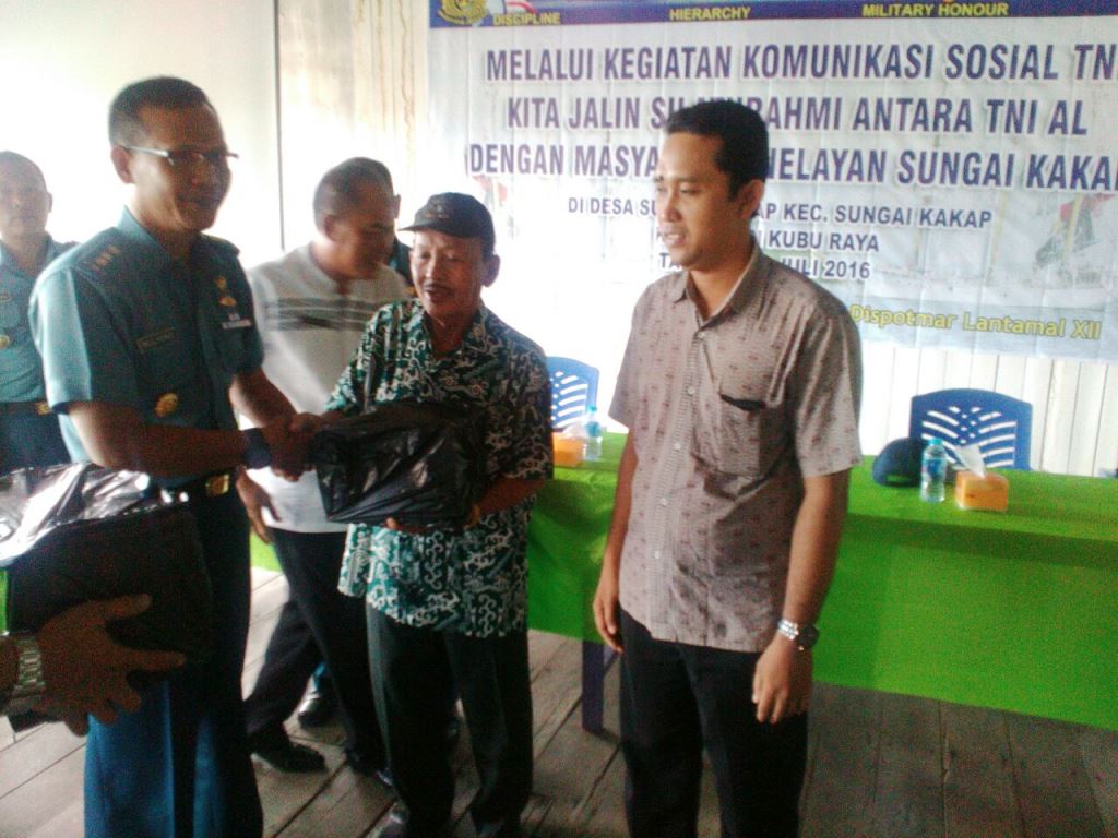 Kadispotmar Lantamal XII Letkol Laut (KH) Drs. Mulyono menyerahkan Sembako untuk masyarakat nelayan sungai kakap dalam rangka kegaiatan komunikasi sosial TNI di Desa Sungai Kakap Kabupaten Kubu Raya, Kalimantan Barat.