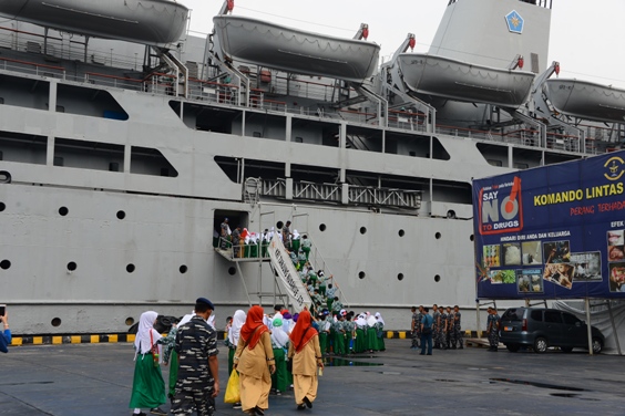 MNOL – Jakarta, Komando Lintas Laut Militer (Kolinlamil) terus memperkenalkan Kapal Perang Republik Indonesia (KRI) sebagai salah satu bentuk mengenali dan menanamkan kecintaan terhadap dunia maritim sejak dini kepada segenap murid-murid Sekolah Dasar. Kali ini, siswa – siswi Sekolah Dasar Islam Al Azhar Kelapa Gading berkesempatan naik kapal perang KRI Tanjung Nusanive 973 yang tengah merapat di Dermaga Mako Kolinlamil, Tanjung Priok, Jakarta Utara, Kamis (15/9).