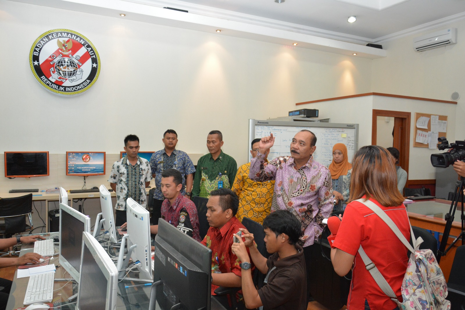 Kepala Bakamla RI Laksdya TNI Ari Soedewo, S.E., M.H., bersama sejumlah awak media ketika memperlihatkan salah satu sarana pemantauan yaitu Monitoring dan Analisa (Monalisa) di ruangan Pusat Informasi Maritim (PIM) Badan Keamanan Laut RI, Jumat (16/12/2016).