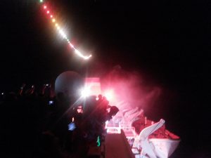 Tepat pukul 12.00 yang menandakan pergantian tahun sirine kapal dan suar berwarna merah memecah keheningan malam di perairan Pulau Edam. Gemerlap kembang api dari Ancol pun terlihat dari kapal yang semakin menambah kemeriahan peringatan tahun baru di KM Umsini.