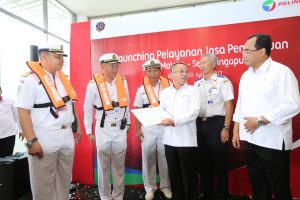 MNOL, Batam – Kementerian Perhubungan secara resmi mendelegasikan wewenang pemanduan kapal laut yang melintasi Selat Malaka dari pemerintah kepada PT Pelabuhan Indonesia I (Persero) atau Pelindo I. Pendelegasian kewenangan secara resmi ini ditandai dengan prosesi penyerahan pilot order oleh Menteri Perhubungan Budi Karya Sumadi juga penekanan tombol sirine kapal pandu dan pemasangan life jacket kepada petugas pandu Pelindo 1 dalam pemanduan Kapal SS LNG Tangguh Batur pada Senin, 10 April 2017 di Perairan Nongsa, Batam, Provinsi Riau Kepulauan.