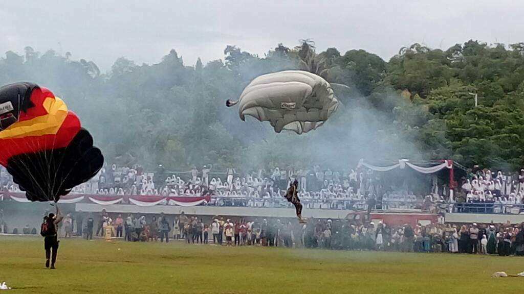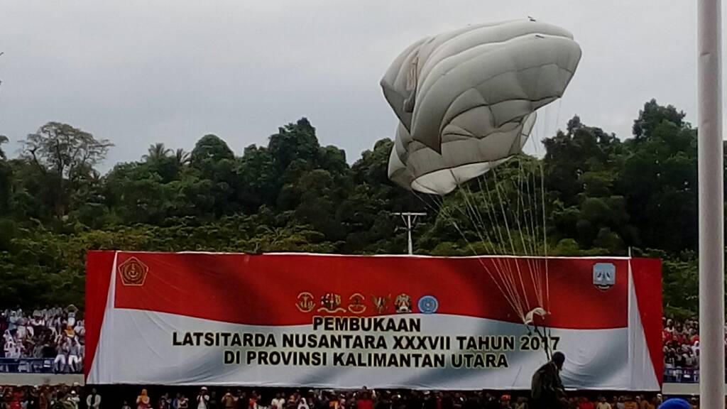 Di antara para penerjun tersebut, bertugas membawa bendera dari TNI AL adalah Kopda Mar. Supriyono yang membawa bendera AAL dan Kopda Mar. Suwarno yang membawa bendera Kaltara. Dari TNI AD adalah Serka Gusti yang membawa bendera Akmil, Serka Yuli yang membawa bendera Akademi TNI, dan Serka Suhari yang membawa bendera Mabes TNI. Dari TNI AU adalah Sertu Edi yang membawa bendera Merah Putih, Kopda Sigit yang membawa bendera AAU, dan Sertu Suwanto yang membawa bendera IPDM. Sedangkan dari Polisi yaitu Briptu Zulfahmi yang membawa bendera Lemdik Lat, Briptu Suyitno yang membawa bendera Akpol. Seluruh penerjun paying tersebut berhasil mendarat tepat di tengah Stadion Datuk Adil Tarakan.