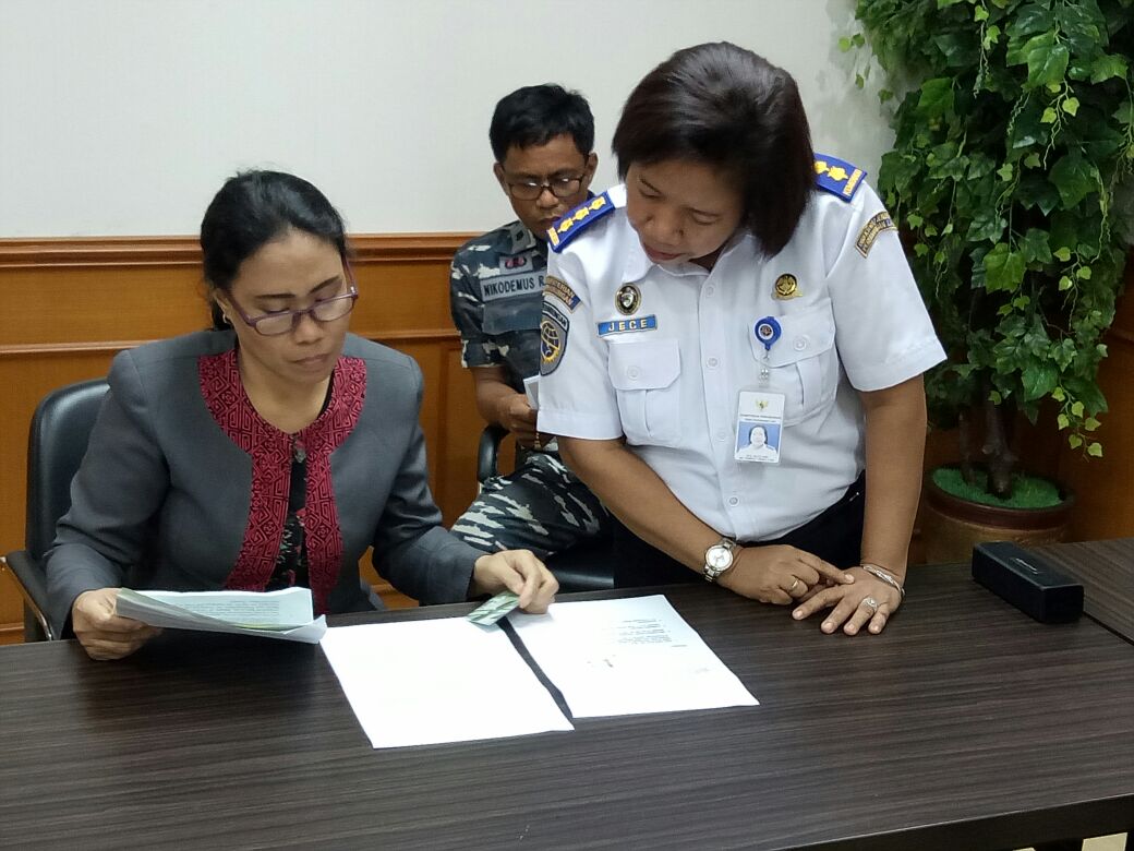 Representative Asuransi P & I Club Indonesia, Soedarjanto menyerahkan santunan sebesar US $ 40.000 kepada Mely Ersita Rantesalu, istri korban disaksikan Kasubdit Pengukuran, Pendaftaran dan Kebangsaan Kapal, Jece Julita Piris mewakili Direktur Perkapalan dan Kepelautan, dan PT BJM Global Indonesia selaku Manning Agency, di Kantor Kementerian Perhubungan, Rabu (27/9).