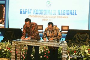 MN, Jakarta – Kementerian Perhubungan (Kemenhub) dan Kementerian Kelautan dan Perikanan (KKP) melakukan Penandatanganan Kesepakatan Bersama tentang Sinergitas Pelaksanaan Pelayanan Publik di bidang kelautan perikanan dalam Rapat Koordinasi Nasional Kelautan Perikanan pada hari Rabu tanggal 4 Desember 2019 di Hotel Borobudur, Jakarta.