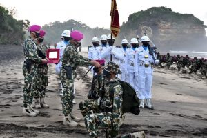MN, Malang – Saat fajar memecah heningnya malam, deburan ombak Pantai Selatan pun membangkitkan semangat 75 Bintara Remaja dan 270 Tamtama Remaja Korps Marinir TNI AL Angkatan XXXIX/2  tahun 2020 dalam Upacara Pembaretan. Bintara dan Tamtama Remaja tersebut resmi menyandang Baret Ungu Korps Marinir, setelah disematkannya baret pada Upacara Pembaretan yang dipimpin langsung oleh Komandan Korps Marinir (Dankormar) Mayor Jenderal TNI (Mar) Suhartono, M.Tr (Han) di Pantai Baruna, Kondang Iwak, Malang Selatan. Senin (19/10/2020).