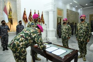 Jakarta (Maritimnews) – Kepala Staf Angkatan Laut (Kasal) Laksamana TNI Yudo Margono memimpin Upacara Serah Terima Jabatan (Sertijab) Asisten Potensi Maritim (Aspotmar) Kasal dari Mayor Jenderal TNI (Mar) Widodo Dwi Purwanto kepada Mayor Jenderal TNI (Mar) Nur Alamsyah bertempat di Ruang Tengah Gedung Utama Mako Korps Marinir Jl. Prajurit KKO Usman dan Harun No. 40 Kwitang Jakarta Pusat, Senin (7/02).