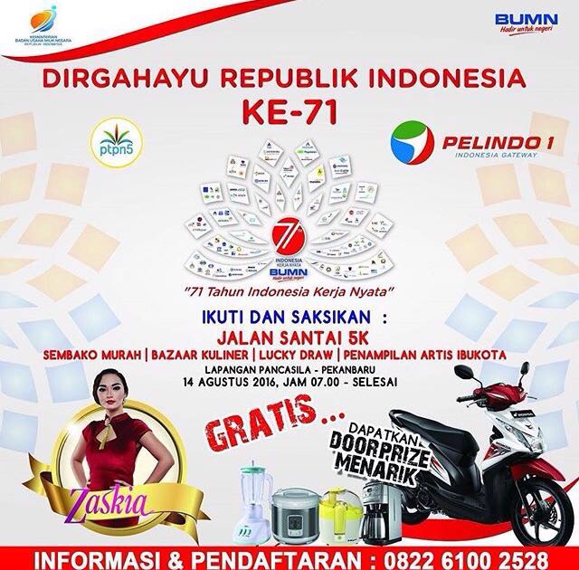 Untuk kegiatan jalan santai 5 Km akan dilaksanakan di lapangan Pancasila, Pekanbaru pada tanggal 14 Agustus 2016 dan dihadiri langsung oleh Gubernur Riau, Arsyadjuliandi Rachman untuk melepas para peserta jalan santai tersebut, didampingi Direktur Utama Pelindo I, Bambang Eka Cahyana dan Direktur Utama PTPN V, Berlino Mahendra Sentosa.