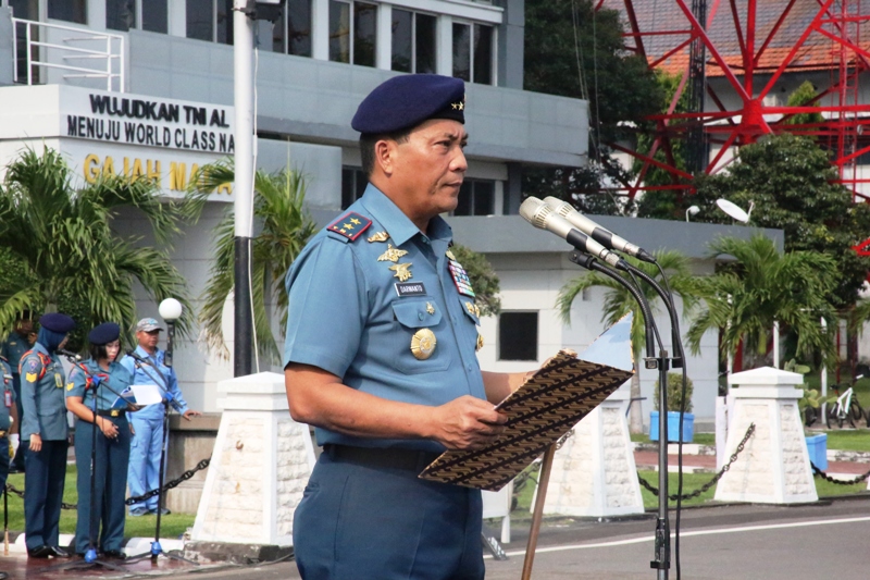 MNOL, Surabaya – Panglima Komando Armada RI Kawasan Timur (Pangarmatim) Laksamana Muda (Laksda) TNI Darwanto, S.H.,M.A.P., memimpin upacara penaikan bendera yang dilaksanakan setiap tanggal 17 bertempat di Dermaga Madura Koarmatim Ujung Surabaya, Senin (17/4).