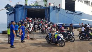 MN, Lampung – Sebanyak 687 penumpang pemudik gratis yang diangkut kapal KRI Banda Aceh 593 Milik TNI AL dan kapal penyeberangan (Roll On- Roll Off) KMP Mutiara Berkah I milik PT Atosim Lampung Pelayaran, sandar di pelabuhan Panjang, Minggu pagi (2/6).