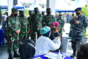 MN, Jakarta – Kepala Staf Angkatan Laut (Kasal) Laksamana TNI Yudo Margono, S.E., M.M., mendampingi Panglima TNI Marsekal TNI Hadi Tjahjanto, S.IP., saat meninjau pelaksanaan vaksinasi hari kedua Prajurit TNI AL wilayah Jakarta di Dermaga Komando Lintas Laut Militer (Kolinlamil), Tanjung Priok Jakarta Utara, Jum’at (26/3).
